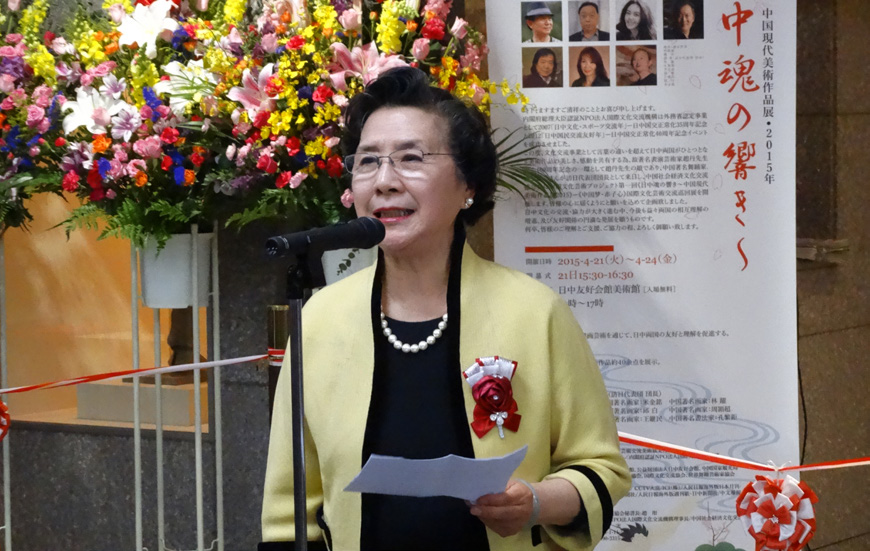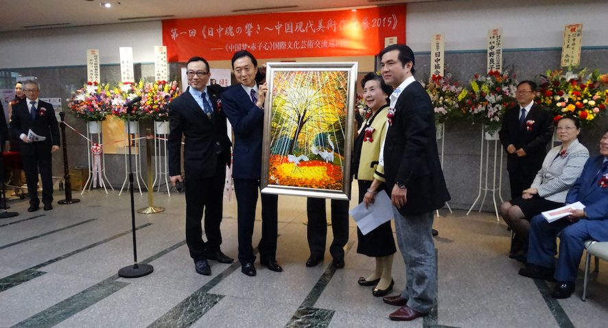 由日本内阁府认证NPO法人国际文化交流机构、社团法人日中交流协会共同邀请中国社会经济文化交流协会主办的首届《日中魂之响中国现代美术作品展2015》一“中国梦赤子心—2015首届日中文化艺术交流活动”于2015421日至424日在日本东京“日中友好会馆美术馆”举办。中国社会经济文化交流协会名誉会长、著名舞蹈家、著名画家赵青领衔范舟(海翁)、米金铭、林跃、徐鸣、邱白、周颖超、李晓玲、王继民、赵琼谢克坦茨、孔繁钜等著名书画家赴日展出40余幅作品。日本前首相鸠山由纪夫、中华人民共和国驻日本国特命全权大使程永华、社团法人中日协会会长兼议院议员野田毅、理事长白西绅一郎、著名演员栗原小卷、中野良子等多位具有影响力的高层官员及各界名流出席了画展开幕式。中国社会经济文化交流协会秘书长刘彤表示,“书画艺术是一个国家文化的象征,可以超越语言的隔阂,传递文化正能量,增进中日两国的友好和理解。”